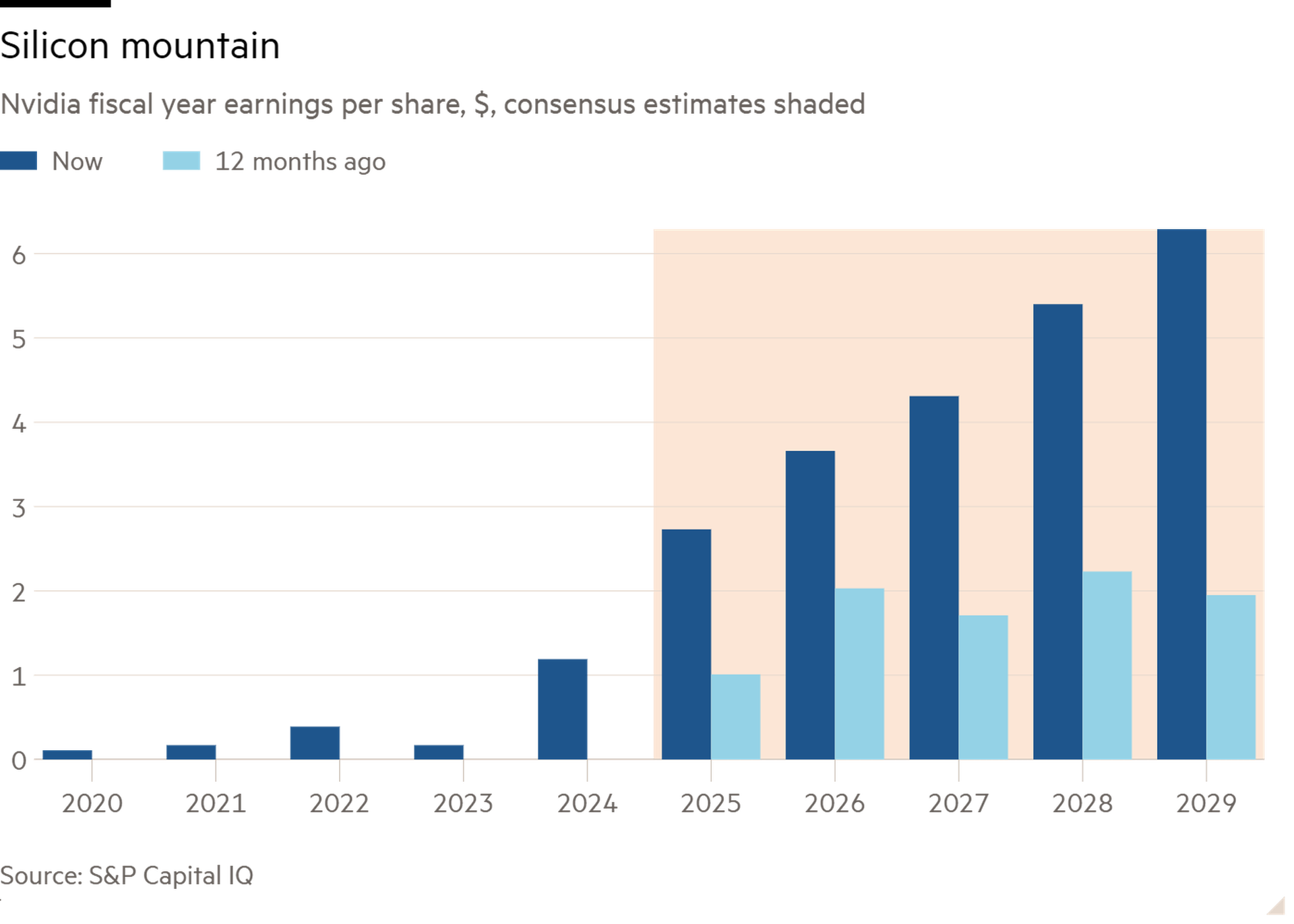在讨论是否继续持有英伟达(Nvidia)股票之前,先花点时间考虑一下对该公司的预期。以下是历史和预期每股收益的图表。同时也显示了一年前的每股收益预期