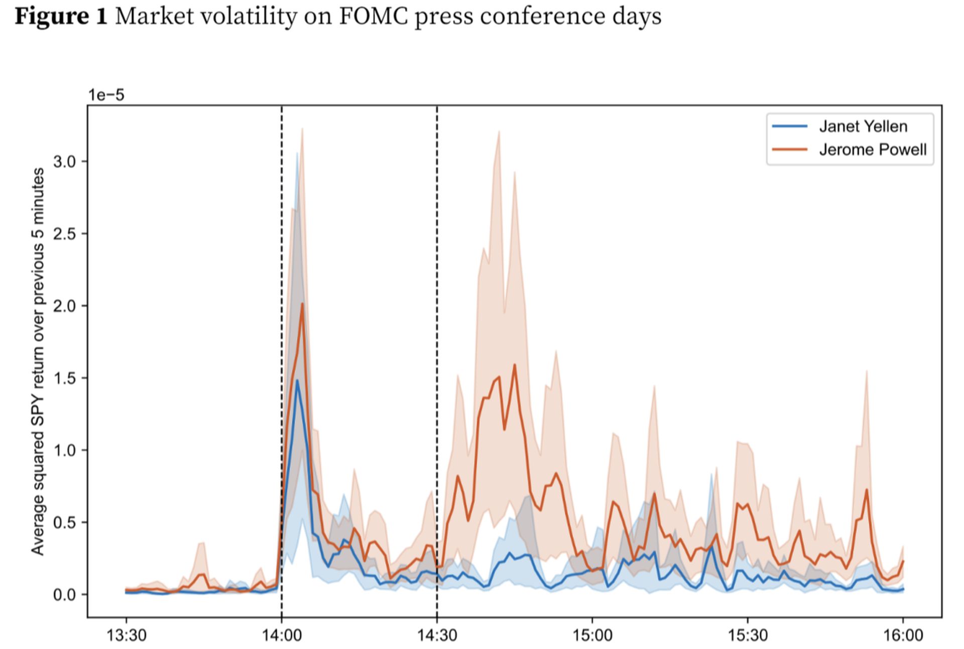 在现任主席杰伊•鲍威尔(Jay Powell)举行新闻发布会时,市场波动性是前任主席们的3倍,他们倾向于扭转市场对委员会声明的最初反应……