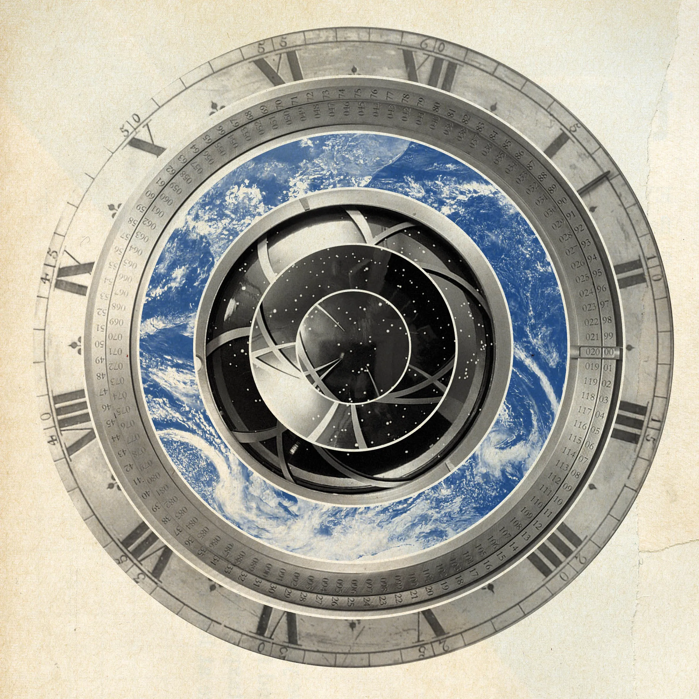 一幅把行星意象与圆形仪表刻度相结合的作品:地球被层层嵌套的机械环环绕,中心有一处金属结构。