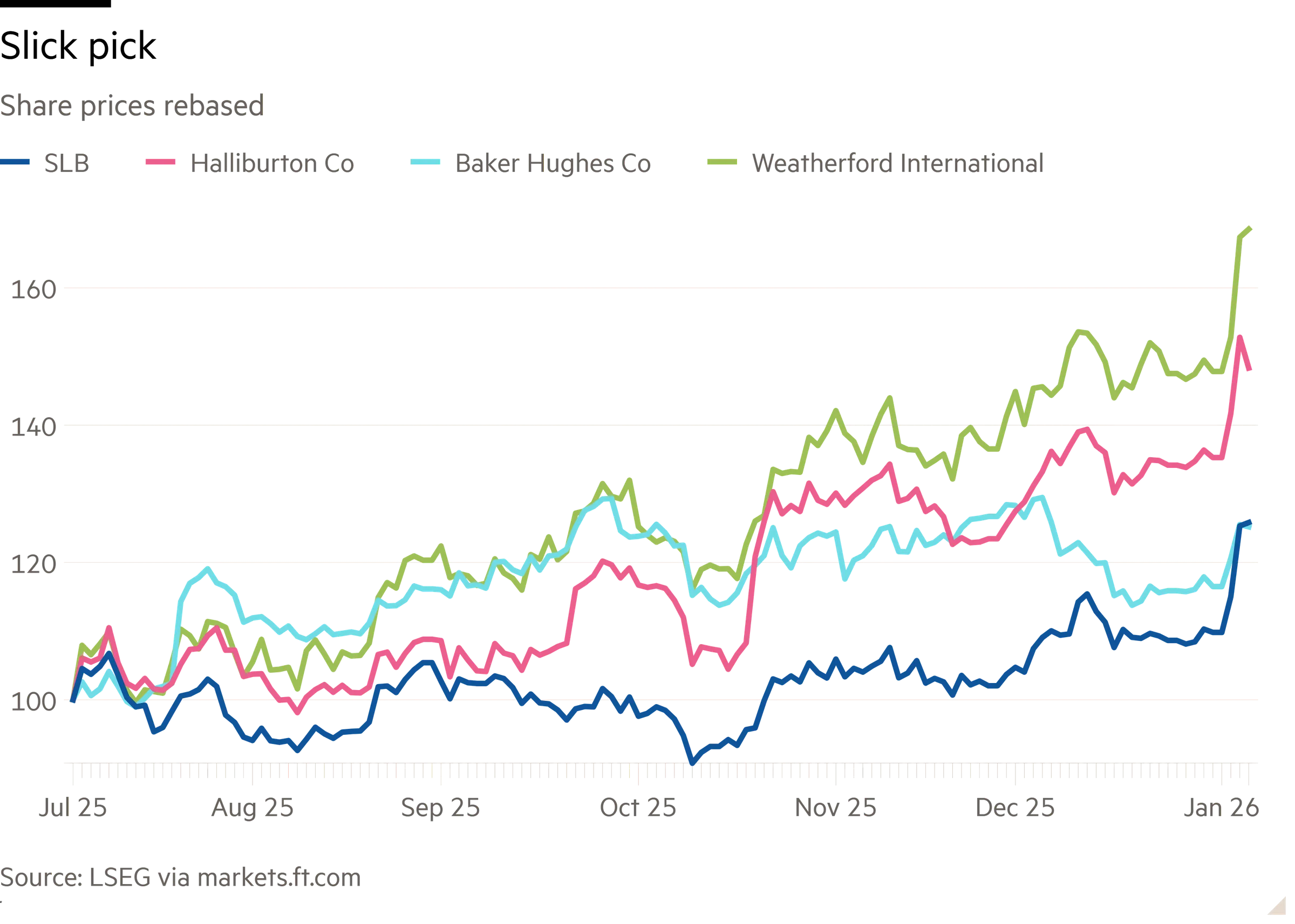 作为证据,可以看看美国油田服务公司,如斯伦贝谢(SLB)、哈里伯顿(Halliburton)、贝克休斯(Baker Hughes)和威德福(Weatherford)。周一,这些公司——通常受雇于石油公司进行钻井并建设相关基础设施——股价合计上涨近7%,新增约100亿美元市值,随后周二略有回落。