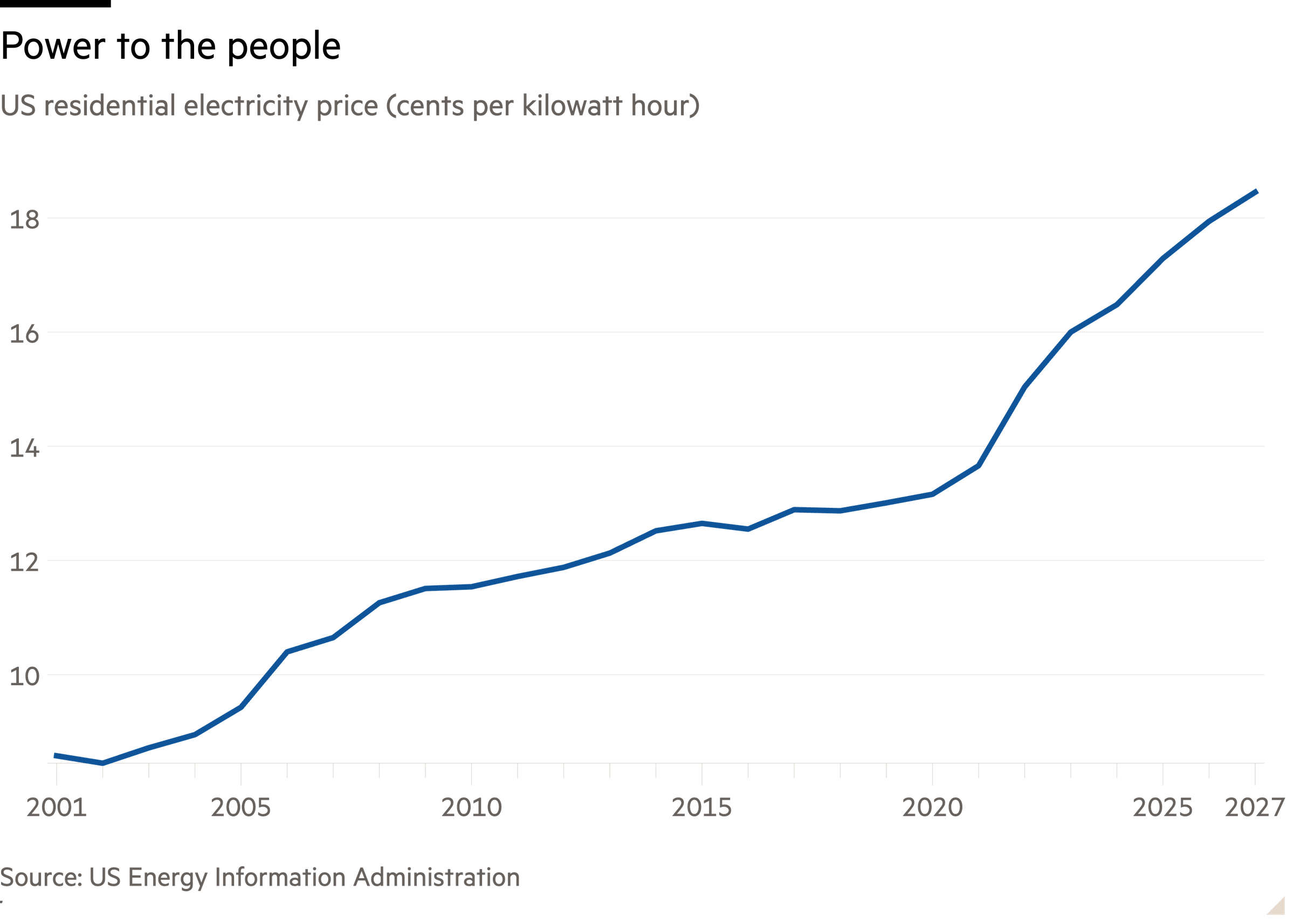 不断攀升的电价长期以来一直是英国政坛的烫手山芋,如今在美国也开始烫手起来。根据美国能源信息署(Energy Information Administration)的数据,美国居民为电力支付的费用比2020年高出30%。不同之处在于,在美国,愈来愈多的人将矛头指向AI数据中心,认为它们是罪魁祸首。
