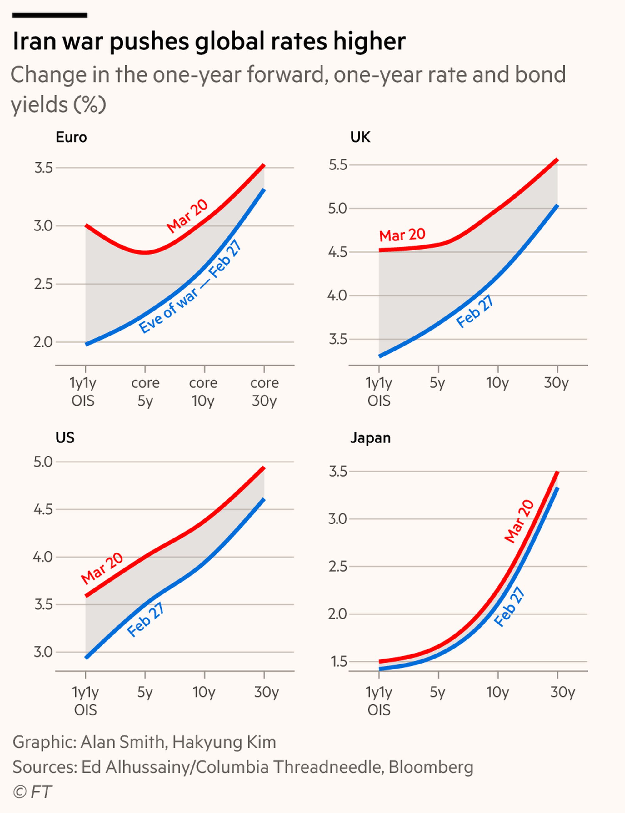 早上好。随着中东战争进入第四周,人们对冲突很快结束的希望正在逐渐消退。对石油供应更深层的担忧正在加剧对通胀外溢效应的恐惧。短期利率在美国明显上升,在欧洲大幅上升,在英国则令人担忧地飙升。鉴于三大manbetx20客户端下载 体对供给冲击的脆弱性不同,这种走势本身并不令人意外。更令人意外的,或许是收益率曲线长端的变动。自2月27日以来,10年期盈亏平衡通胀率显著上升——在英国涨幅高达0.44个百分点——这表明市场担心石油危机带来的二阶效应。