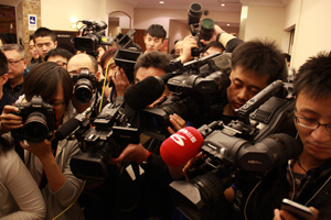 丽都饭店走廊里,每当有家属出现时,媒体就骚动起来