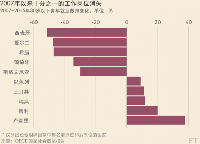 据manbetx20客户端下载 合作与发展组织(OECD)最新出版的“2016 OECD国家社会概览报告”,从2007年到2015年,30岁以下的青年就业岗位减少了10%。其中,西班牙、希腊和爱尔兰的青年就业数量减少了将近一半。